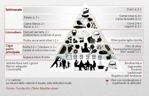 Al fine di rendere più facilmente percepibile al consumatore quali siano gli alimenti compatibili ai principi della Dieta Mediterranea, la «Fondazione Dieta Mediterranea» con sede a Barcellona (Spagna) ha messo a punto il grafico della piramide alimentare, di seguito riportato.